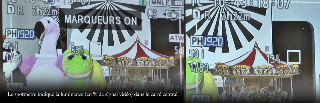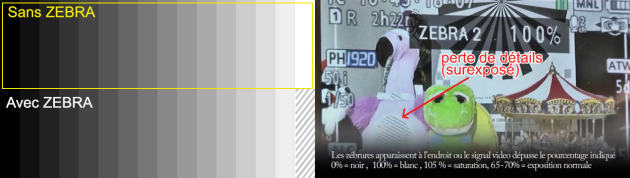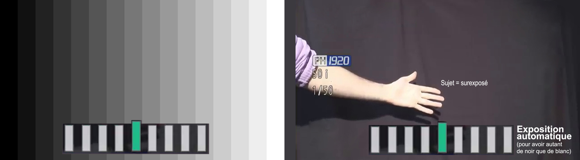 Avec un réglage « EXPOSITION AUTOMATIQUE », la machine va s'efforcer de nous fournir autant de noir que de blanc. Si on filme une mire comme ci-dessous à gauche pas de soucis (pas de surexposition), Mais si on filme un film d'horreur dans l'obscurité (ou un concert), alors attention car la machine, pour offrir autant de lumière que d'obscurité, va devoir éclaircir le noir et « cramer » le sujet (surexposition !)